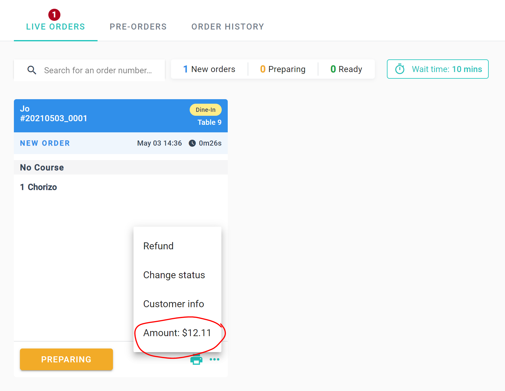 We've had feedback from venues that it would be helpful to be able to view the order total from the live order screen. Regardless of the way your customers choose to pay, you can now view the order total by clicking on the right bottom corner of any order. In the pop you can now see the order amount: