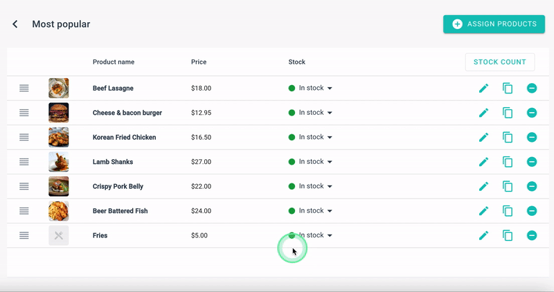We have built a simple and easy solution for managing your product stock levels. On the product list page or category pages, you can now add a stock quantity to help you keep track of what you have left. When you add a stock count to a product, the count will reduce when customers order it from your menu. When the count reaches 0 it will automatically be marked as unavailable.