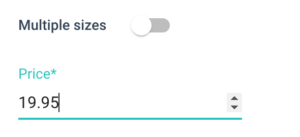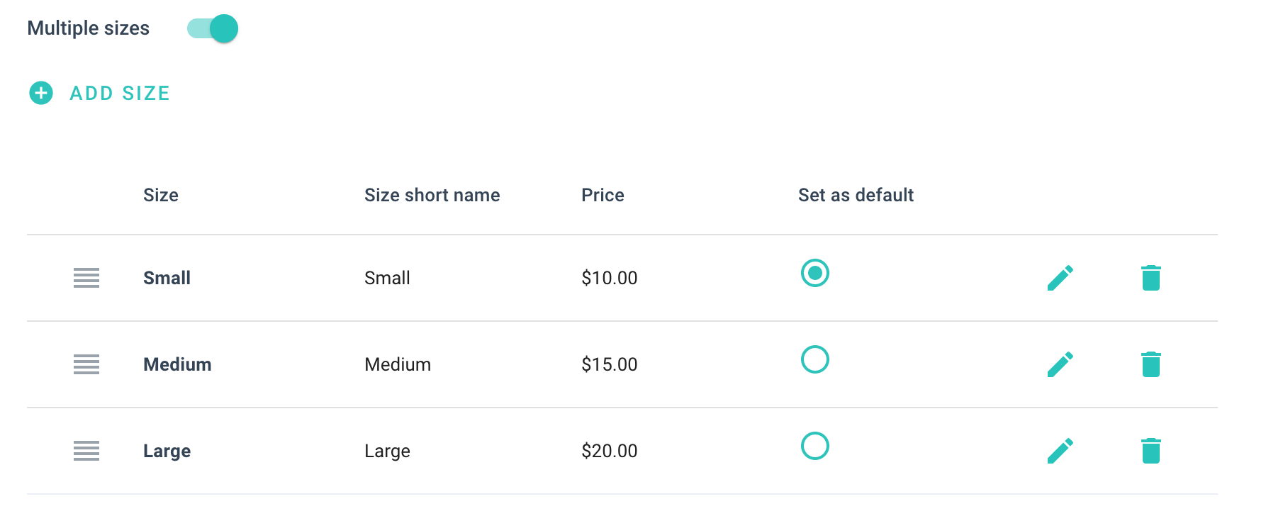 If your product is offered in multiple sizes, toggle this on. Click the Add size button to create your sizes. You will need to set a default size (this size is pre-selected for customers).