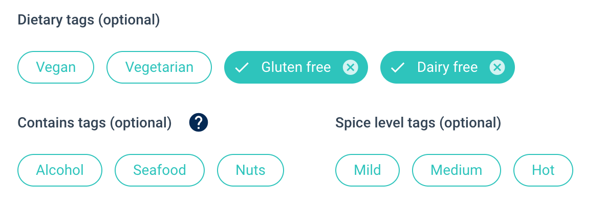 Add tags to your product to help customers who have special dietary requirements. The Alcohol tag will require customers to confirm their age before ordering these products.