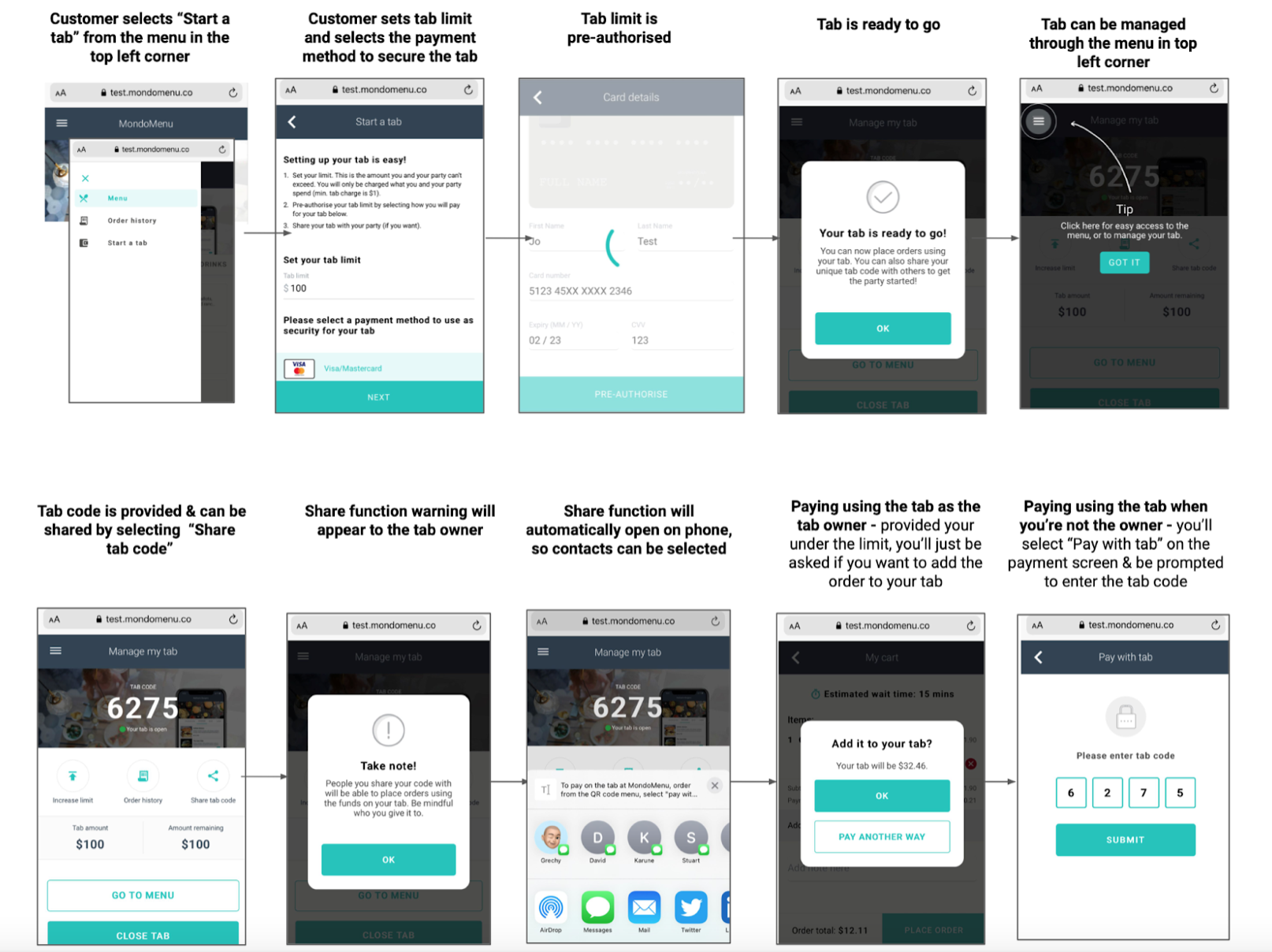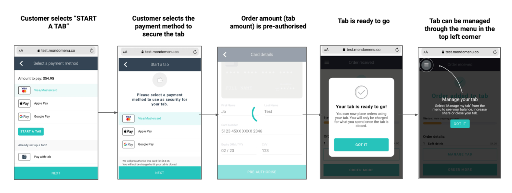 This type of tab is usually set up because the tab owner wants to share the tab with others. This again requires no action from you as the venue and as the purchase is pre-authorised, there is no risk to the venue. The process for a customer to set up a tab in this way is: