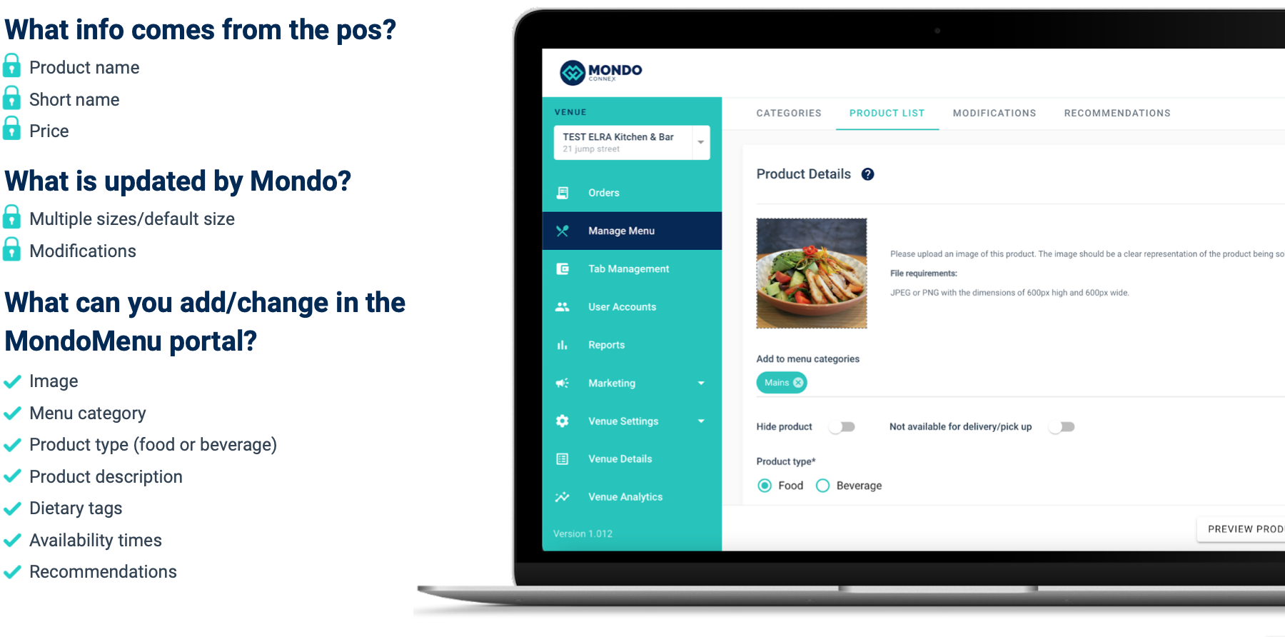 While there are many features in the Mondomenu portal that you can customise at venue-level, you won’t be able to make changes to information that is directly linked to your POS.