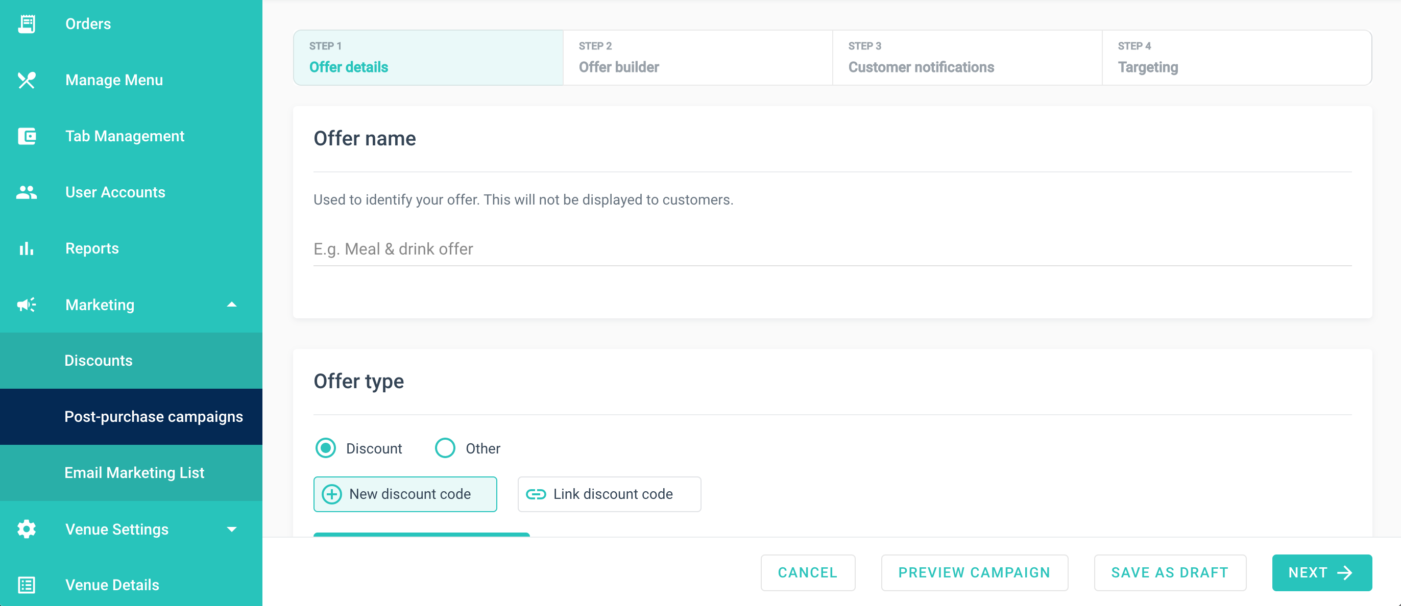 To create an offer, go to the Post-purchase campaigns page within the Marketing section. click Create campaign and select Offer. When creating an offer you will be guided through the following four step process: