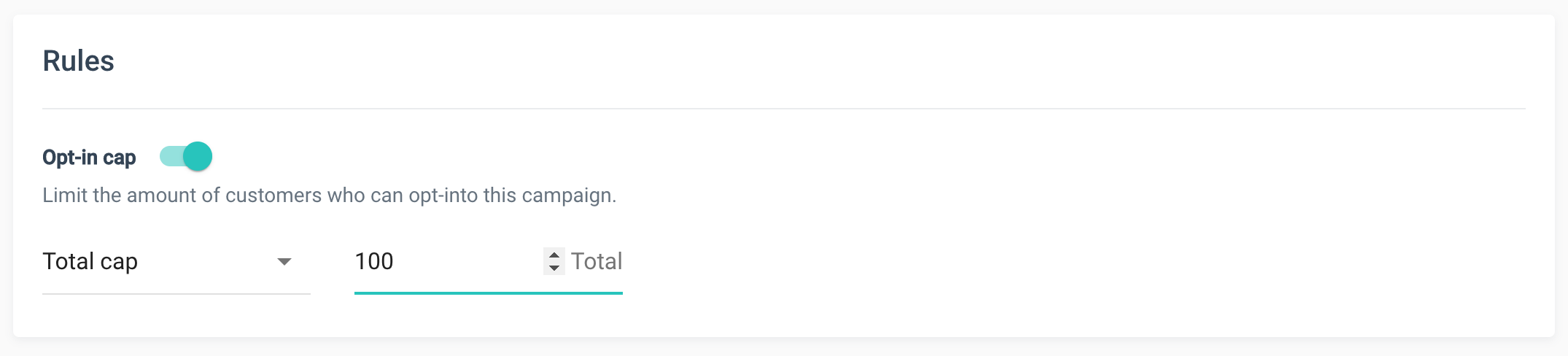 In this section you can set an opt-in cap. This will limit the amount of customers who can opt-into your campaign. You can set a total cap (the total number of customers who can opt-in for the duration of your campaign), or a daily cap.