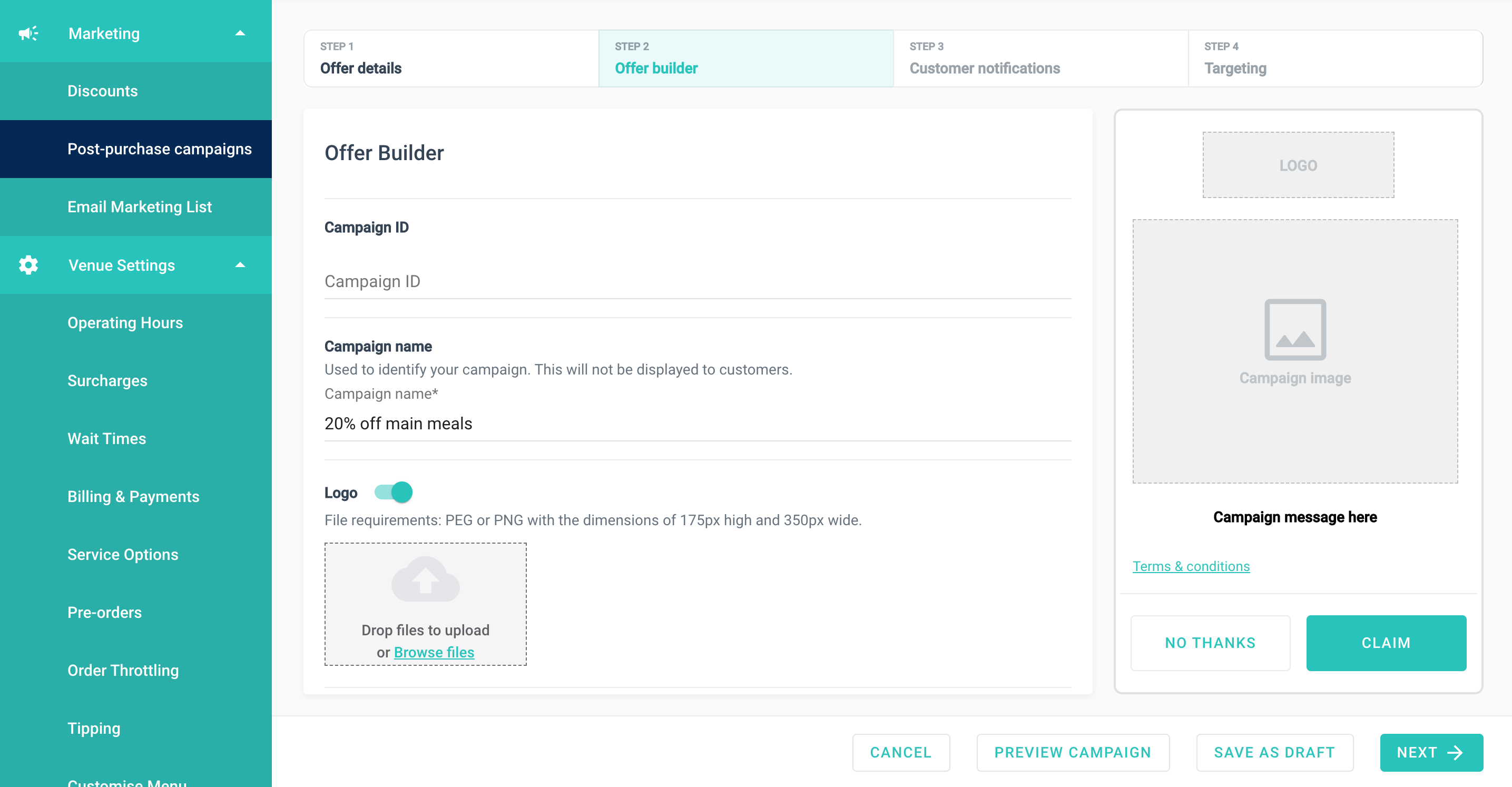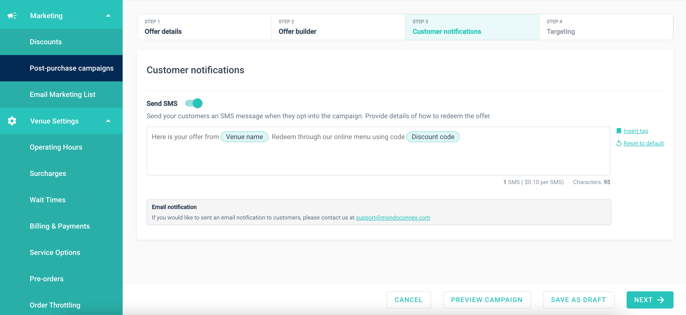Use the campaign message to outline what you're offering. You want this to be clear, but also as concise as possible. Customers might not fully engage with the offer if there is too much information to process. We find that messages that are short, sharp and clear have the best success.