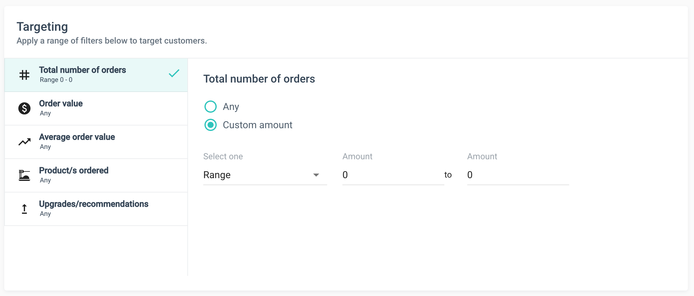 You can apply a range of filters to determine which customers get to see your offer. The filtering options are based on the customers order history including the products they order or the amount they spend. These filters are useful if you want to reward customers for repeat visits or for spending over a certain amount.