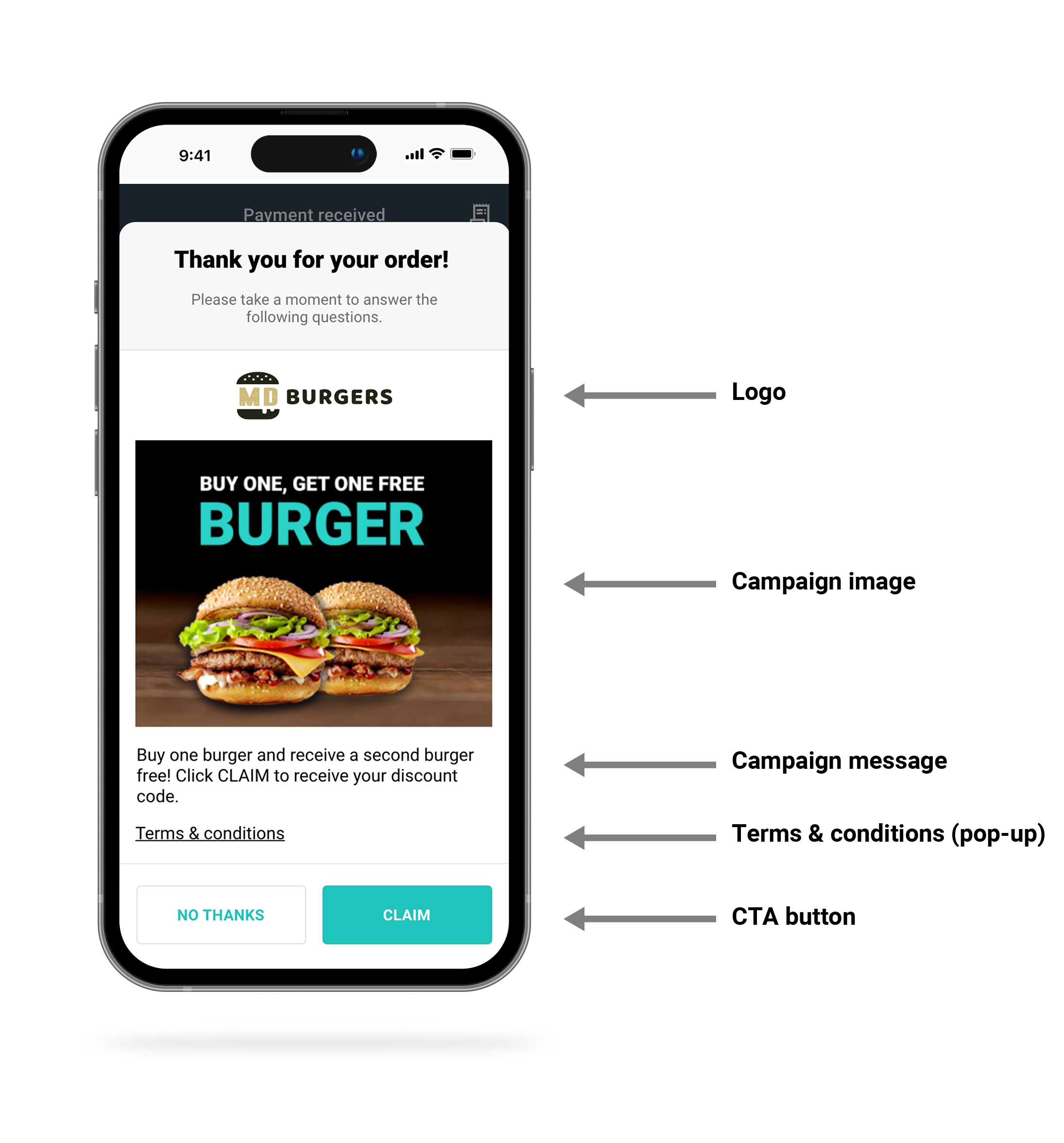 This is the button that customers click to opt-into your campaign. Your button text should make it clear what action the customer is taking. For example, you could say "Claim" or "Claim offer". Your CTA button also needs to make sense within the context of the rest of your offer elements. For example, if your campaign message reads something like "Would you like to receive our 2 for 1 pizza deal", your CTA button could say "Yes" or "Yes please".